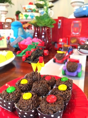 Para enfatizar o tema, Kátia Hefter usou um autêntico barril de óleo como anexo a mesa principal, que serviu de apoio para as garrafinhas de suco. Carrinhos de plástico ficaram perfeitos como suporte e toppers para os docinhos. Tudo para deixar o clima mais lúdico!!